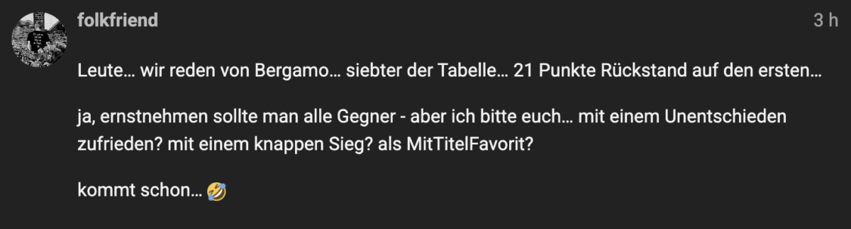 Wobei man natürlich, was keiner tun wird, den Gegner nicht unterschätzen sollte. Frag nach beim BVB. Auch einige andere deutsche Mannschaften durften in der Vergangenheit schon unangenehme Erfahrungen mit den Lombarden machen. Die leichtfüßige Jägerin Atalanta (lies nach bei Gustav Schwabs „Sagen des klassischen Altertums“) ließ sich nicht so leicht erwischen. Aber Bayern ist nicht der BVB und Platz 7 in der Liga spricht nun auch nicht gerade für die Unüberwindbarkeit der Männer aus Norditalien.