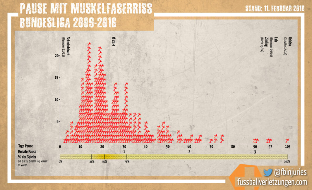 Die Ausfallzeit bei Muskelfaserrissen variiert stark, denn sie hängt von der Schwere des Risses ab. Der nicht mehr aktualisierte Blog „fussballverletzungen“ gab vor Jahren einen Überblick mit den Daten in der Bundesliga zwischen 2009 und 2016. Spieler mit einem Muskelfaserriss fielen dabei im Schnitt 25,4 Tage aus. Zahlreiche Spieler feierten ihr Comeback bereits innerhalb von zehn bis 20 Tagen.