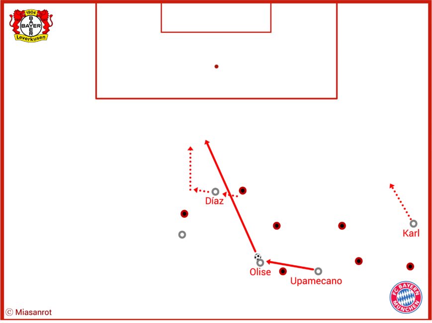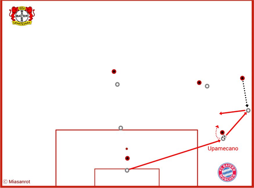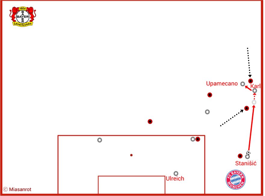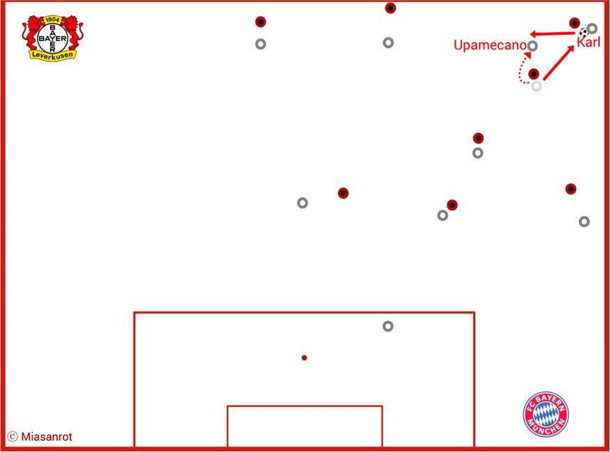 Upamecano macht jetzt erneut das, was er mit Stanišić schon zuvor probiert hat: Er spielt Karl an und bleibt sofort drin im Angriff, indem er sich in der Schnittstelle der Leverkusener wieder anbietet. Karl spielt rüber zu Upamecano und plötzlich ist der Raum erstmals da, um sich aus dem Druck zu befreien und die Seite zu verlagern.