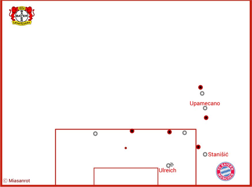 Aber Ulreich spielt zurück in den Druck auf Stanišić und hier geht der Spaß so richtig los – also für alle außer die Leverkusener.