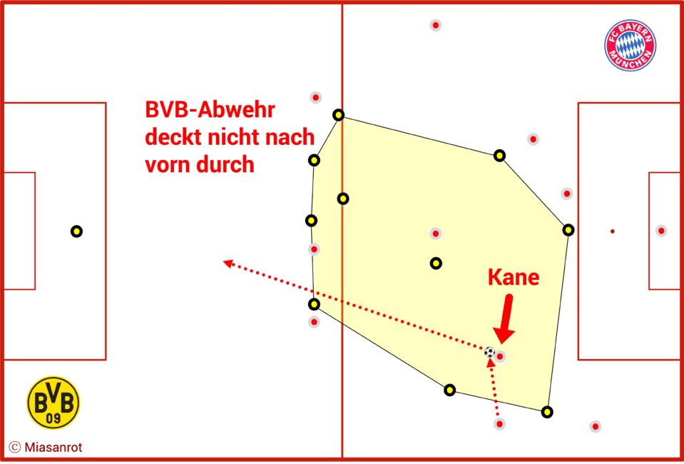 Dortmund ging dann über in ein höheres Pressing und hier konnten die Bayern ihre fußballerischen und taktischen Qualitäten voll ausspielen. Eine Schlüsselrolle nahm Harry Kane ein.
