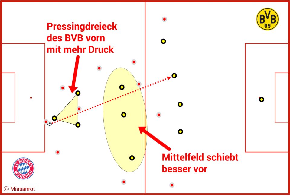 Und dann agierte auch das zentrale Mittelfeld des BVB aktiver und deckte nach vorn mit durch. Bayern spielte darauf hin zu viele unkontrollierte lange Bälle, die gleich wieder bei den Gästen landeten.