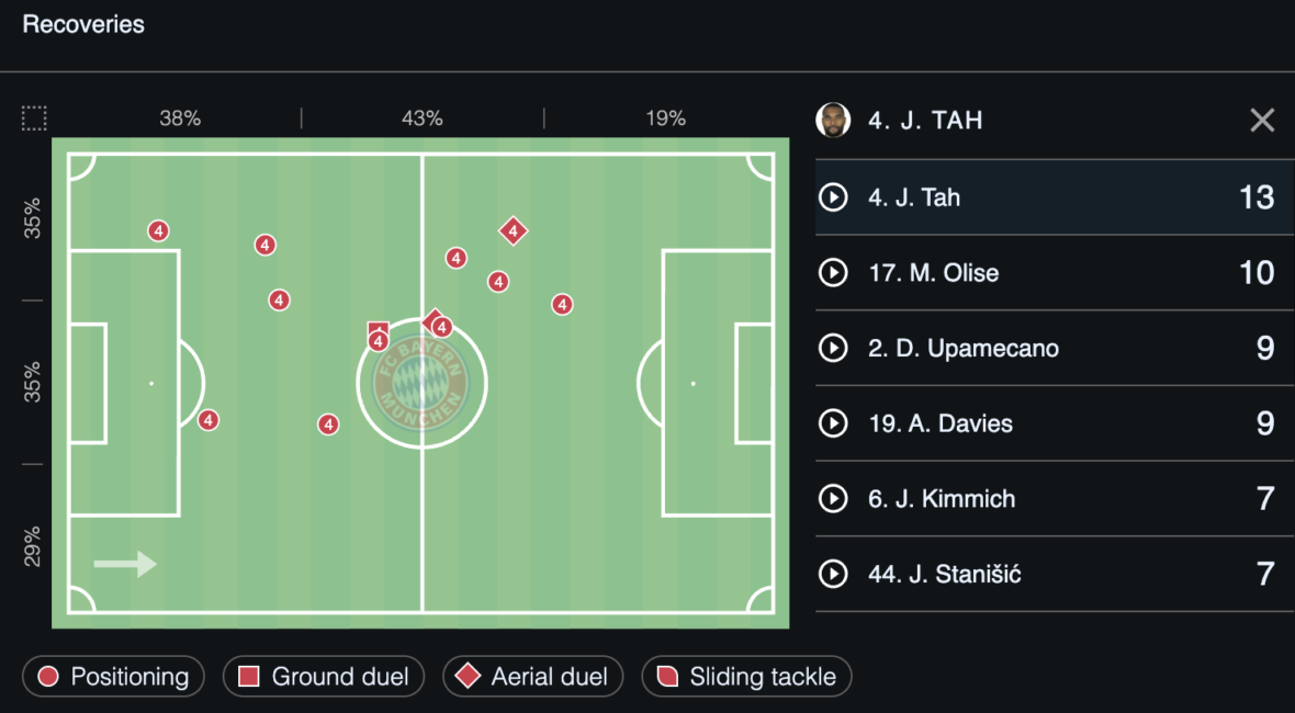 Gegen Leipzig hatte Tah beispielsweise 13 Balleroberungen – die meisten im Bayern-Kader. Kaum eine davon war spektakulär.