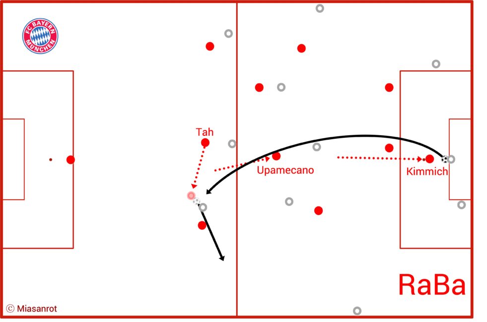 In dieser Situation war exakt das wohl gewollt: Kimmich attackiert hoch, Upamecano schiebt vorsichtig nach. So, dass er in Reichweite zum ehemaligen Kimmich-Gegenspieler ist, aber auch so, dass er bei einem langen Ball schnell wieder hinten ist. Leipzig schlägt die Kugel lang in den nun größeren Raum zwischen Stanišić und Tah.
