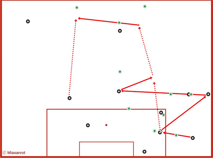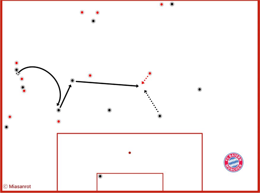 Olise spielt den Ball wieder nach innen, allerdings erstmal zu Bischof, der auf den durchstartetenden Upamecano ablegt. Der Innenverteidiger hat mittlerweile alle Gegenspieler hinter sich gelassen und dribbelt weiter bis fast zur Mittellinie. Dort legt er quer auf den ebenfalls losgelaufenen Konrad Laimer auf der linken Seite. Der wiederum schickt Díaz in den Lauf.