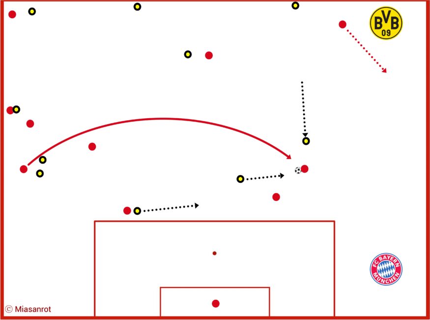 31 ihrer insgesamt 55 langen Bälle spielten sie damals in der zweiten Halbzeit. Bayern ließ sich vom BVB nach einer taktischen Umstellen mit höherem Pressingdreieck zu sehr in Hektik versetzen. Die langen Bälle gaben den Dortmundern Ballbesitz, Spielkontrolle und sorgten vor allem dafür, dass die Bayern nun häufiger in der Situation waren, hoch zu pressen.