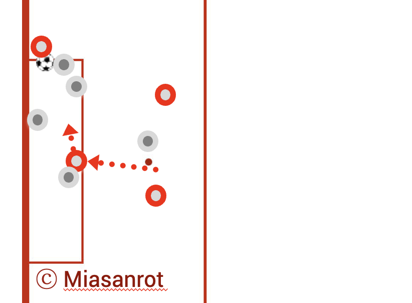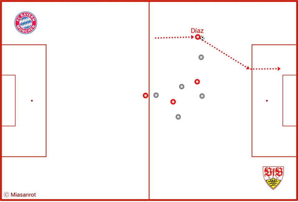 Und auch bei Seitenverlagerungen ist Díaz ein Spielertyp, der sofort für Druck sorgt. Sobald er den Ball bekommt und etwas Raum sieht, sucht er den Weg in Richtung Gegenspieler. So wie hier in Stuttgart, als ein Seitenwechsel bei ihm landet und er Tempo aufnimmt. Dabei dribbelt er diagonal nach innen, um den Verteidiger zurückweichen zu lassen und ihn unter Druck zu setzen. Wenn der Verteidiger diagonal nach hinten Verteidigen muss, ist das kognitiv schwerer als das geradlinige Mitlaufen.