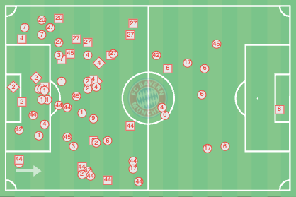 Fairerweise ging es da gegen das beste Team der Champions League. Trotzdem waren es nur sechs Balleroberungen im Angriffsdrittel und nur elf in der gegnerischen Hälfte. Wobei die höchste „Balleroberung“ von Leon Goretzka nicht wirklich eine war, sondern aus einem Duell bei einem Standard mit in die Statistik einfloss.