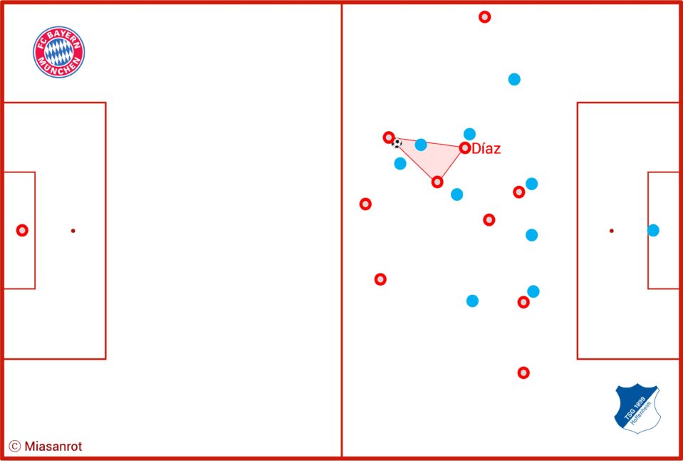 Auch gegen Hoffenheim war er in seiner Positionierung sehr flexibel. Das liegt daran, dass er auch als Kombinationsspieler eine immense Bedeutung hat. Viel wird über Kane gesprochen, wenn er sich ins Mittelfeld fallen lässt. Aber auch Díaz nutzt die Zwischenräume in der gegnerischen Abwehrformation klug und findet dort Räume zum engmaschigen kombinieren mit seinen Mitspielern.