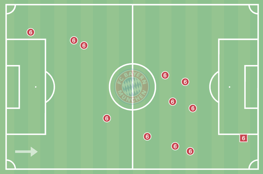 Trotzdem ist es wichtig für die Bayern, dass sie das Zentrum sinnvoll verteilt besetzen. Zwei Innenverteidiger sind in der Regel das Minimum, um die Tiefe einigermaßen sicher abzusichern, aber auch das Maximum, um ausreichend Spieler in Mittelfeld und Offensive zu haben. Denn dort soll schließlich für Durchbrüche gesorgt werden, die vor allem in Gleich- oder Überzahl entstehen.