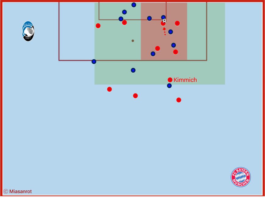 Bayern hat einen eigenen Angriff und kommt gefährlich in den Strafraum. Dann kommt Atalanta in Ballbesitz. In der roten Zone kommt es jetzt nur auf eins an: Druck machen. Alle vier Bayern-Spieler orientieren sich sofort an den Spielern, die an den Ball kommen könnten oder den Ball haben. Der Druck ist so groß, dass die Italiener nur unkontrolliert klären können.