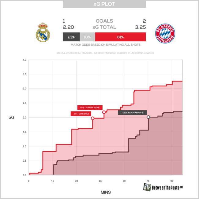 Ebenfalls bemerkenswert: Das Modell von BetweenThePosts errechnet eine Siegwahrscheinlichkeit von 61 Prozent für den FC Bayern anhand der Chancenqualität beider Mannschaften. Bedeutet: Laut dieser Berechnung würden die Münchner bei diesem Spielverlauf rund sechs aus zehn Duellen gewinnen. Kein Fakt, aber eine nette Spielerei. Auch wenn Fußball dynamischer ist als solch mathematische Modelle.