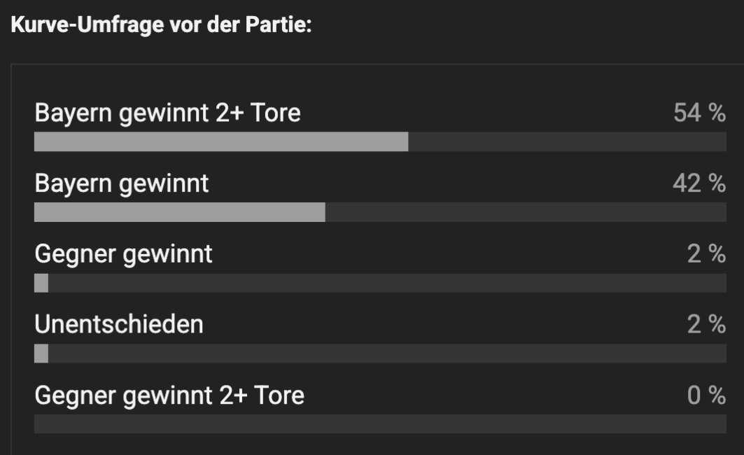 Großer Optimismus herrscht diesmal vor, dass die Bayern nicht nur gewinnen, sondern das auch noch souverän tun werden. Mehr als die Hälfte geht von einem Sieg des FCB mit zwei oder mehr Toren Unterschied aus.