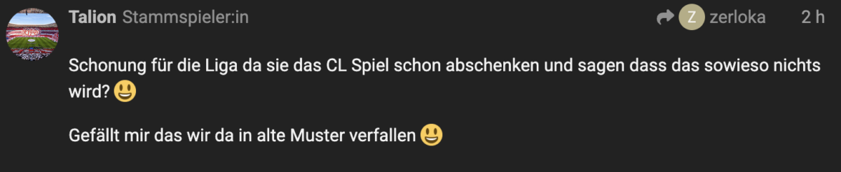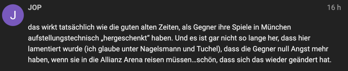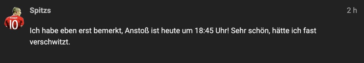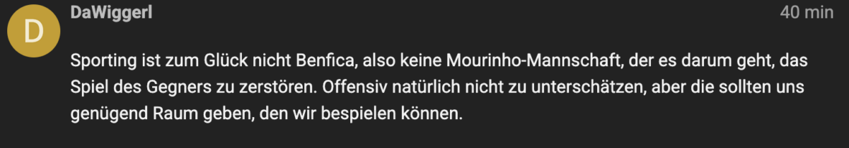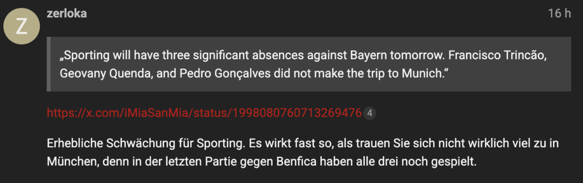 In den Kommentaren dreht sich derweil vieles um die Personalsituation beim Gegner. Drei wichtige Spieler fallen aus und werden nicht mal im Kader stehen. Der eine oder andere Fan des FCB wittert da schon Angstschweiß. Eine Vorsichtsmaßnahme vor einem Spiel, das die Portugiesen wahrscheinlich eh nicht gewinnen?